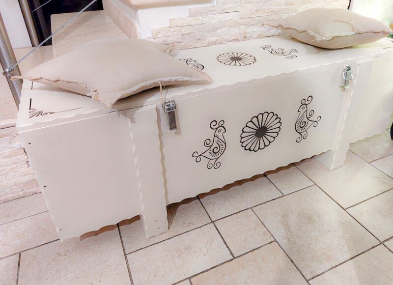 Panca in legno con decori incisi in stile Sardo. Disegno grafico Pavoncella Sarda creata da Decor_Erika