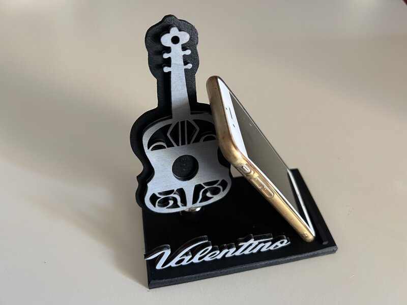 Porta smartphone da tavolo interamente realizzato in legno verniciato. Accuratamente assemblato e personalizzato con simbolo chitarra e nome. Utilizzabile come bomboniera o idea regalo molto originale, personalizzabile con altro nome che può essere comunicato al momento in cui verrà inserito l’ordine. Dimensioni base 16x9x1 cm