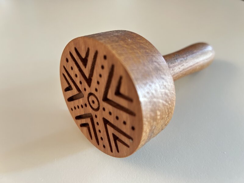 Timbro per pasta fresca con la tipica "Pintadera Sarda" diametro 6 cm realizzabili in tantissime varianti, con decori su richiesta. Con particolare lavorazione nella base che presenta tre scanalature. Ci occupiamo personalmente dell'elaborazione grafica, della realizzazione con macchinari all'avanguardia e dell'assemblaggio con un pratico manico in legno. Teniamo a mantenere i disegni il più originali possibili, che presentano piccole imperfezioni, così da avere un lavoro unico e artigianale, nonostante i sistemi moderni.