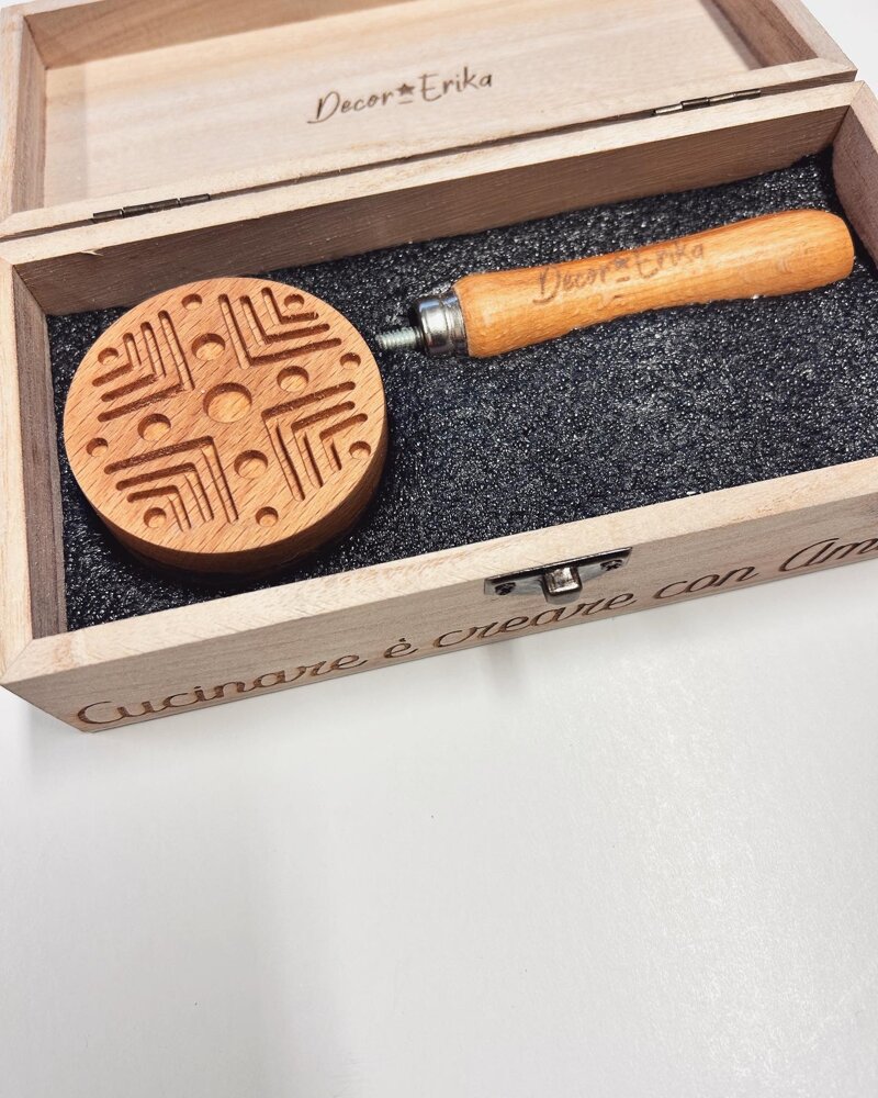 Timbro pasta fresca in pregiato legno, con un diametro di 6 cm e manico in legno. Per la realizzazione dei tipici corzetti o corsetti.