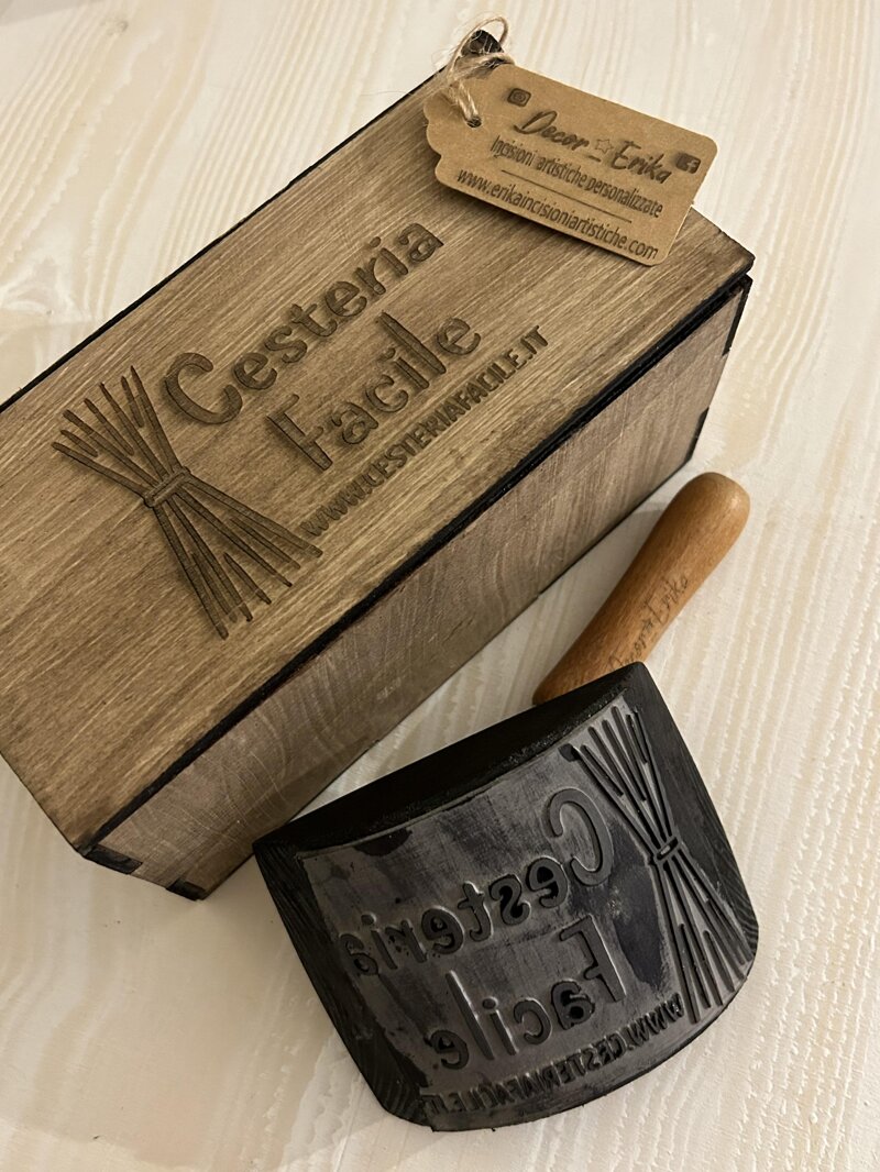 Set scatola in legno contenente un timbro per inchiostro realizzato e personalizzato con logo attività. I prodotti sono realizzati ed assemblati sotto esclusiva ordinazione del cliente. Elementi utilizzati sono il legno accuratamente intagliato su misura e verniciato. La gomma viene utilizzata per l’esecuzione dell’immagine e della scritta o logo richiesti. Personalizzabili con scritte e disegni su richiesta quando viene effettuato l’ordine. Articolo unico realizzato esclusivamente con metodi unici ed artigianali che richiamano lo stile dei timbri di una volta.
