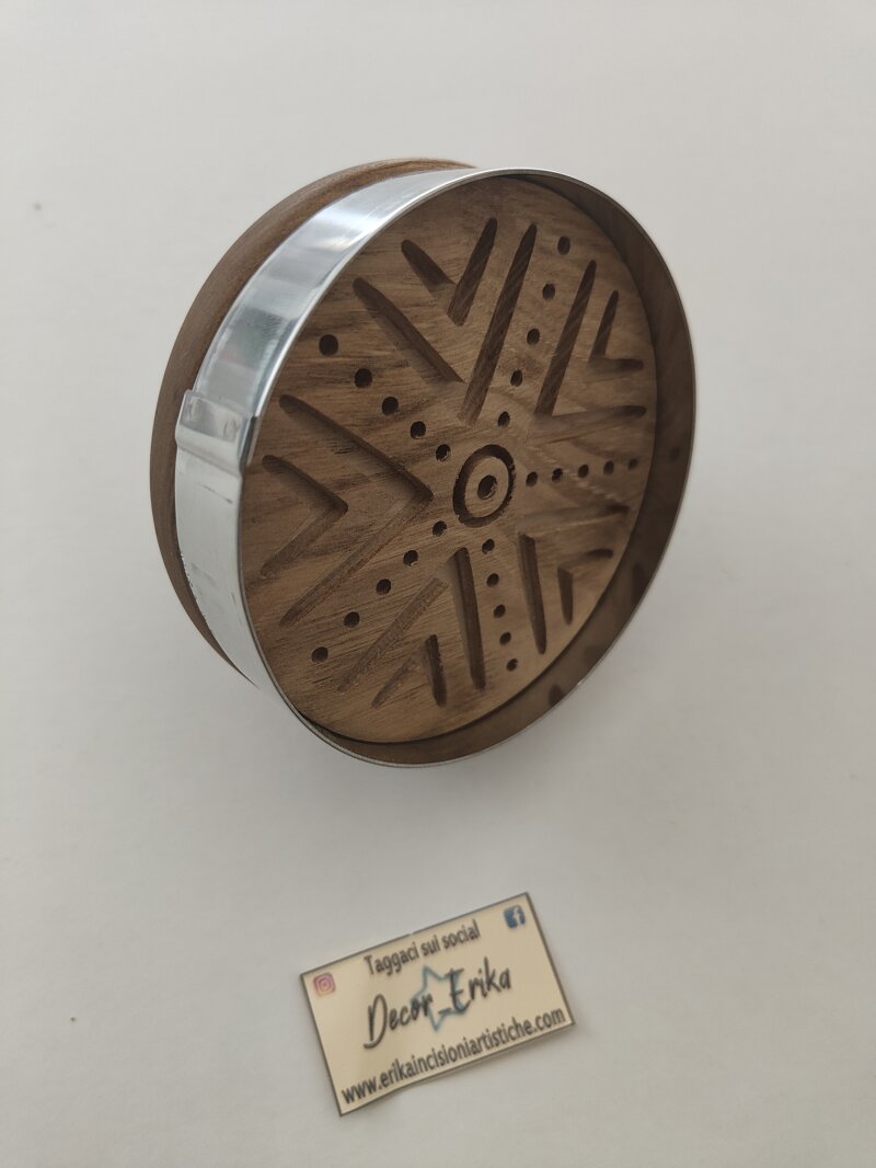 Timbro per Seadas con la tipica "Pintadera Sarda" diametro 10 cm realizzabili in tantissime varianti, con decori su richiesta. Ci occupiamo noi dell'elaborazione grafica, della realizzazione e dell'assemblaggio con un pratico manico in legno. In questo caso è stata aggiunta un'anella in acciaio esterna che permette sia di lasciare il timbro che di tagliare allo stesso tempo anche la pasta. Può essere utilizzato anche per decorare la pasta fresca, pane e panadas.