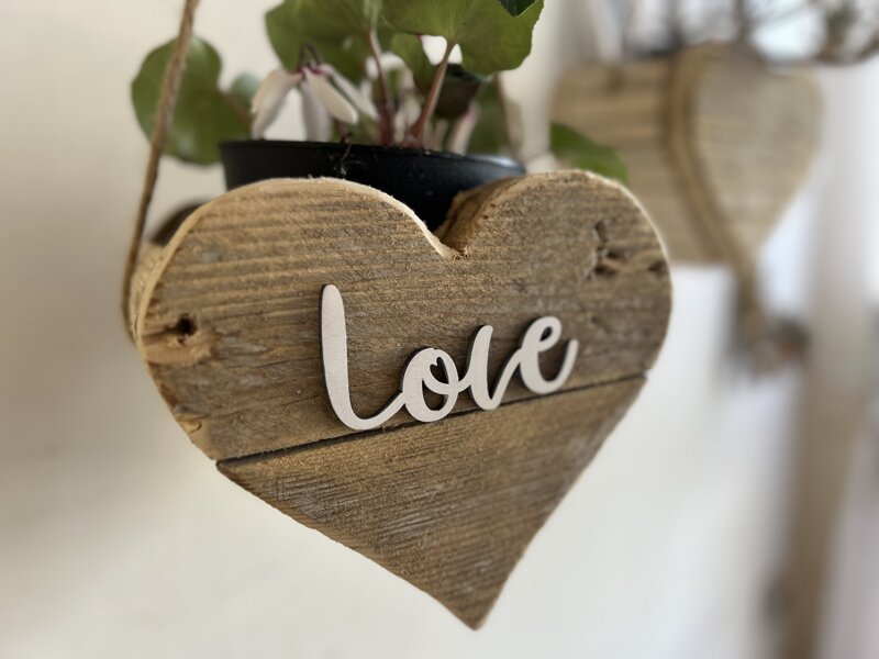 Porta vaso realizzato artigianalmente in legno grezzo con prezzi di recupero e assemblato a forma di cuore. Sistemazione spago laterale per poterlo appendere e apposizione scritta LOVE nella parte frontale. Un’ottima idea regalo per San Valentino, utile, funzionale ed originale.